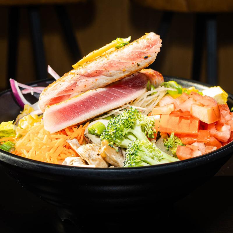 A big bowl of fresh greens with shaved red onion, tomatoes, mushrooms, and assorted garden vegetables | Choose: Ponzu | Ginger Vinaigrette | Chipotle Ranch | Soy Vinaigrette | Wasabi Vinaigrette | Add: Salmon* (6 Oz.)** | Tuna* (6 Oz.)** Shrimp (9 of ‘em - Grilled or Fried) Steak* (7 Oz.)** | Chicken (8 Oz.) +$8