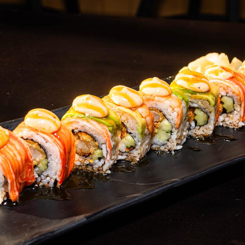 Shrimp tempura and cream cheese, topped with fresh salmon, avocado, eel, teriyaki glaze and Japanese mayo drizzle