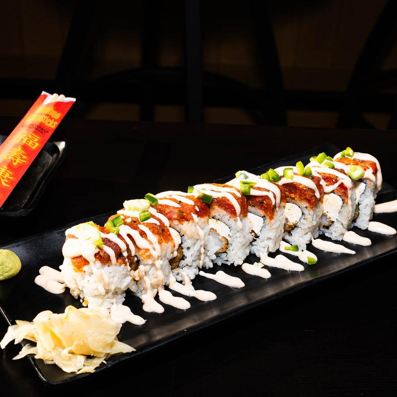 Dynamite roll faced up, topped with spicy tuna, and sriracha drizzle